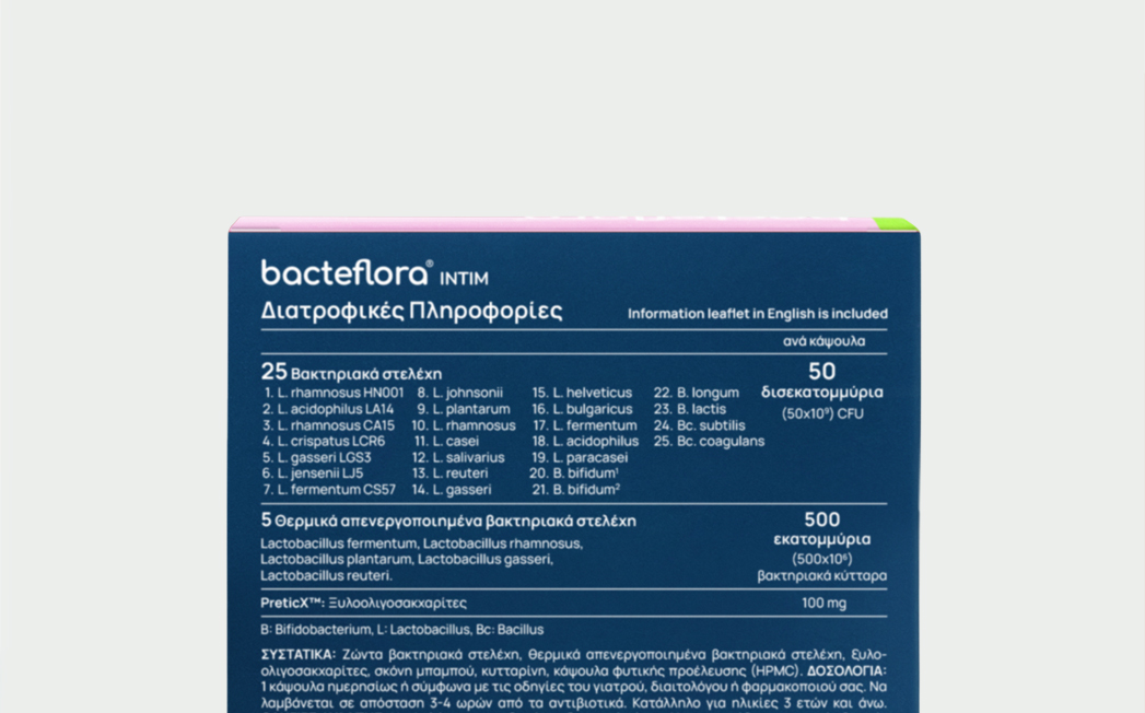 Specialized combination with 25 different probiotic strains, 50 billion CFU per capsule, prebiotic xylooligosaccharides and postbiotics for vaginal microbiome. Contains a high precent of live and tyndallized Lactobacillus strains to enhance the normal vaginal microbiome, that consists of Lactobacillus bacteria, whose population is influenced by the intestinal microbiome. Suitable for women with frequent vaginal and intestinal microbiome disorders, preventing and improving symptoms of vaginitis and mycosis.