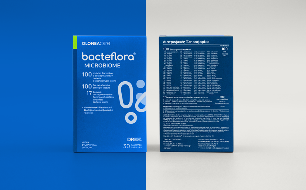 Innovative composition of 100 strains for the biodiversity of the gut microbiota and the gut microbiome. Bacteflora Mircrobiome is the unique product with 100 different strains of bacteria and saccharomyces, 100 billion per capsule, 7 specially selected metabiotic and flavonoid MicrobiomeX® Flavobiotic®. The 100 live Bacteflora Microbiome strains belong to 7 different genera and 29 species, representing a significant part of the natural diversity of the gut microbiome.
