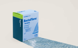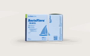 A combination of 10 bacterial strains providing 30 billion CFU per capsule, prebiotic inulin, and Lactopost® D, a postbiotic, heat-inactivated Lactobacillus rhamnosus strain. It helps balance the gut microbiome and contributes to protection against diarrhea when travelling, especially in situations where foodborne infections are more common.