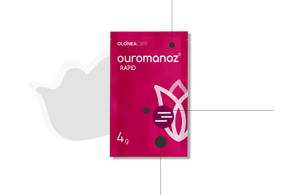 Contains D-mannose birch origin, cranberry PACRAN®, hibiscus Ellirose™, probiotics, prebiotics and vitamin C from acerola. Supports the treatment of cystitis and urinary tract infections. ouromanoz® RAPID improves pelvic pain, frequent urination and burning feeling when urinating immediately and effectively.
