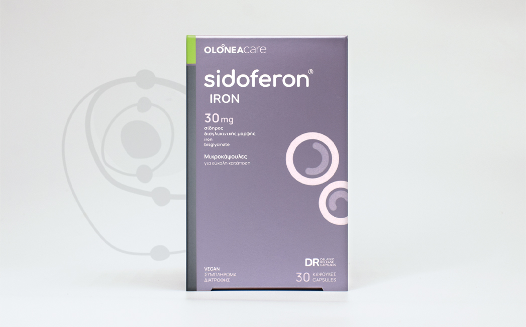 sidoferon® IRON PLUS30 mg of iron bisglycinate of maximum bioavailability and 160 mg of Vitamin C time release pallets. Does not cause constipation, or upset stomach, and is taken without dietary limitations.