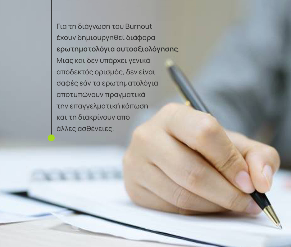 Το πιο συνηθισμένο ερωτηματολόγιο είναι το «Maslach Burnout Inventory» (MBI), το οποίο αναπτύχθηκε αρχικά για ερευνητικούς σκοπούς και απευθύνεται σε διαφορετικές επαγγελματικές ομάδες. Φυσικά πολλά είναι τα ερωτηματολόγια που κυκλοφορούν στο διαδίκτυο, τα οποία όμως δεν συστήνονται.